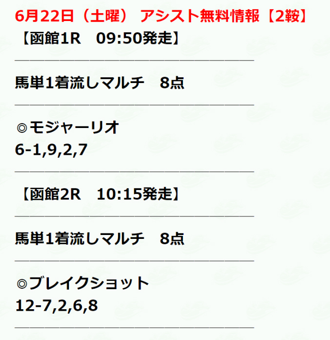 気を取り直して、日曜日に公開されていた買い目がこちらになります。