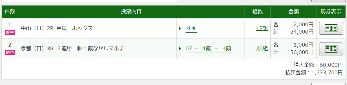 5万でも的中は的中っすね! 長期で見て1週間7日使えばちりつもで30万越え、一発狙ってはずれるよりこれくらいの的中をコンスタントに貰えた方が嬉しいですね!