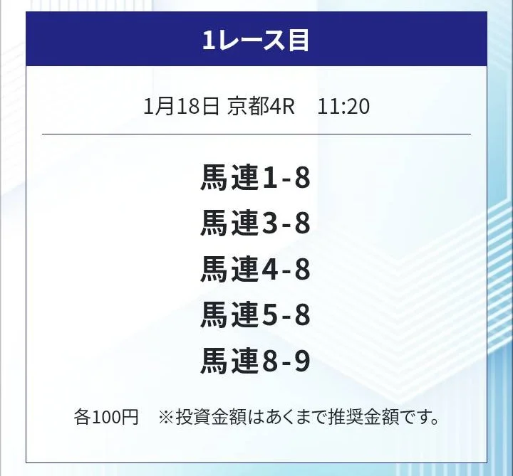 めちゃめちゃ当たってるイメージのオールウィンまずは無料情報から試してみました。 ここは他の競馬予想サイトとは違い、平場レースだすんだ?って印象、この日は京都4R無料予想。 3連複6-8-9的中(5,180円)馬券代が3,600円が10,360円と約3倍!! 美味しいですねこういう予想、複数無料予想出してくれたのに単日5~6万稼げそうですが無料は1鞍だけかな? 満足いく結果でした。