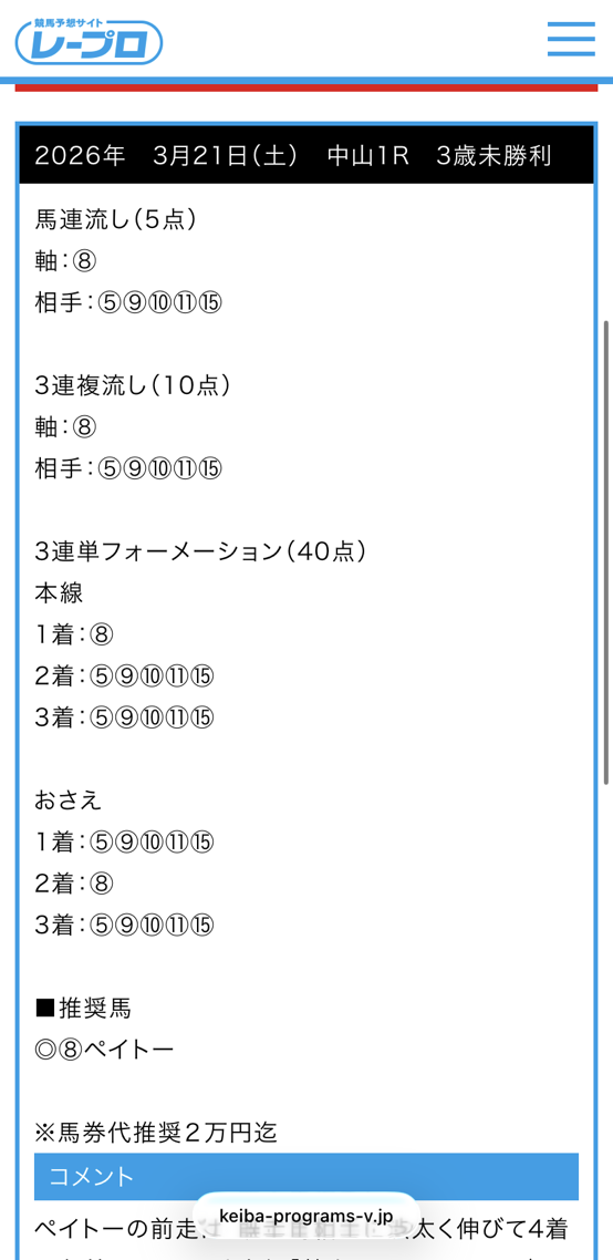 配当狙って3連単1点狙いで無料予想使って正解でしたわ! 馬券代2万円推奨だったので1点500円点数40点で2万円に合わせて利用しました。結果は馬連も3連複も3連単も当たり、唯一馬券買っていた3連単のオッズは317.4倍も付いてくれたおかげで馬券代2万がかすみますね!!! 推奨通りの購入で15万8700円払い戻しでした、朝一発目のレースからこんな的中もらえると痺れますね!